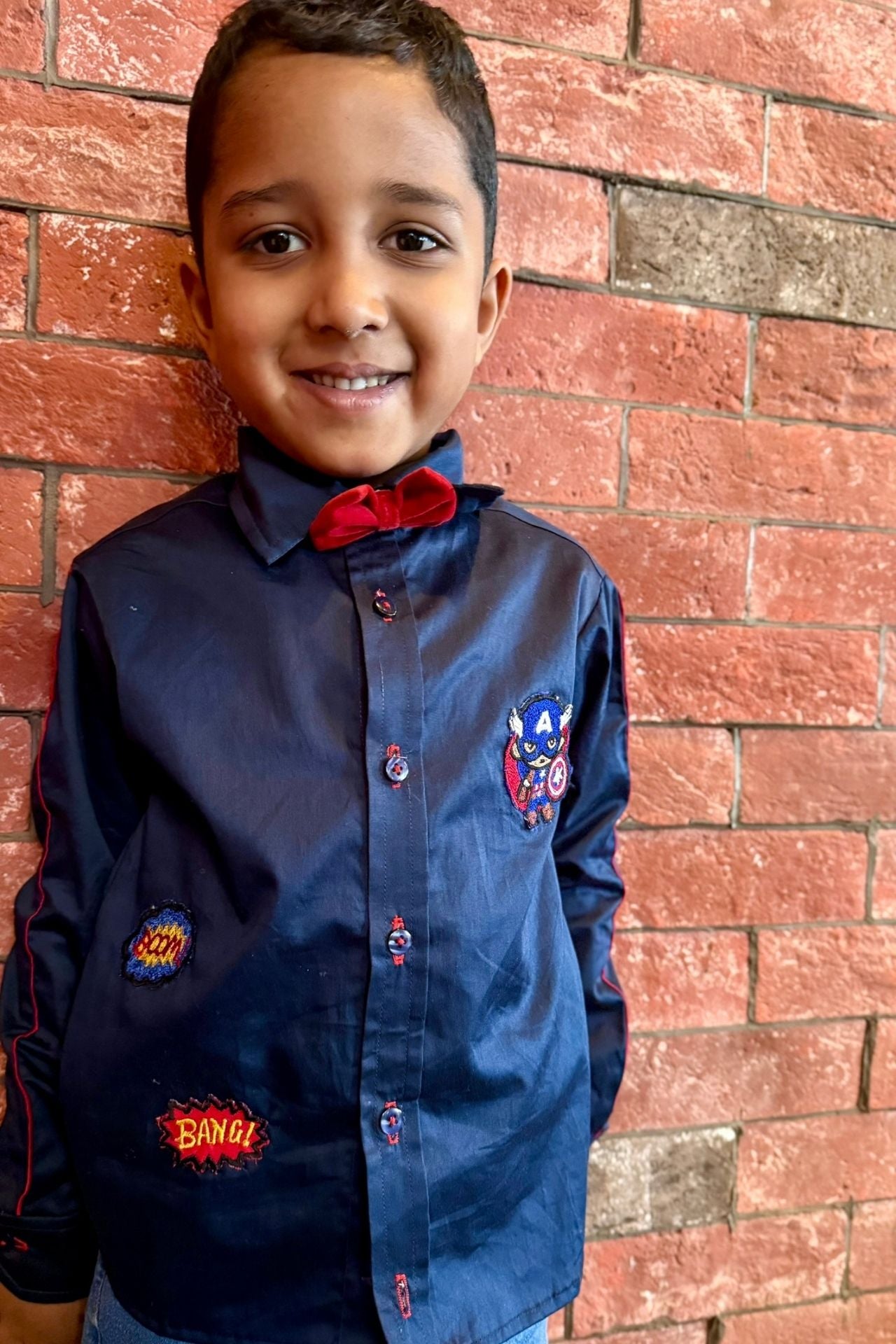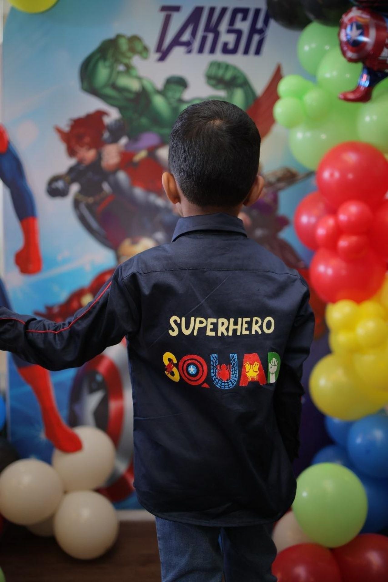 A navy blue Avengers shirt for the mini superhero who’s ready to save the party.