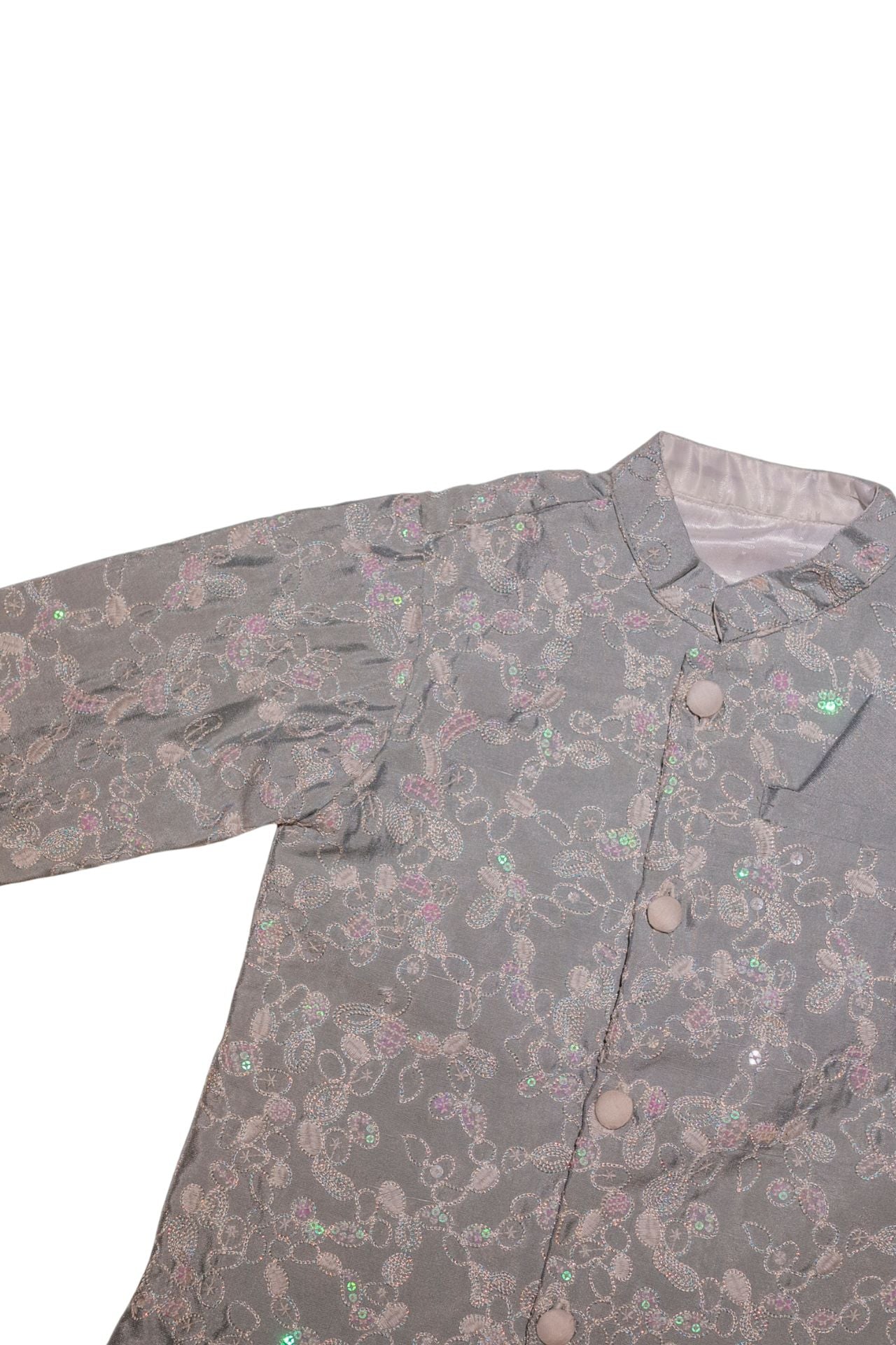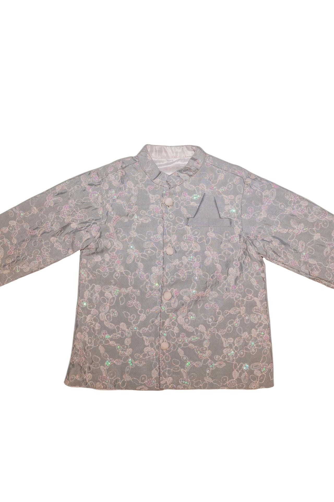 The Grey Bollywood Achkan with Pyjama brings a dapper, star-styled touch to your little one’s festive wardrobe. Crafted in a soft, shimmering grey with a structured silhouette, this achkan set is comfortable yet statement-making — perfect for weddings, sangeets, and Diwali celebrations. Designed for easy movement and all-day wear, it balances glam with comfort for boys who love to dress sharp.