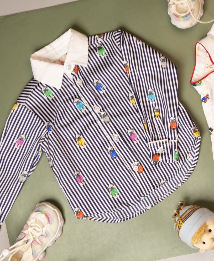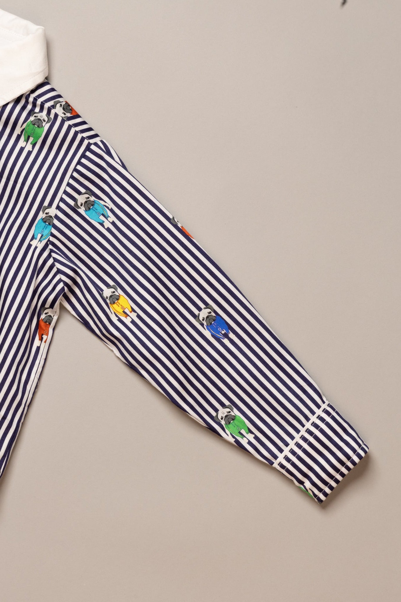 For the dog lovers! This shirt brings together adorable pug faces and clean vertical stripes, making it both smart and spirited. Great for brunches or picnics in the park.