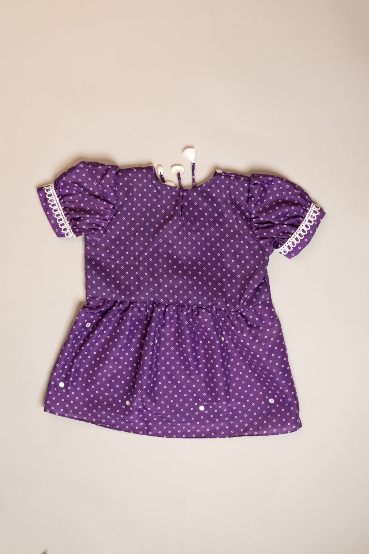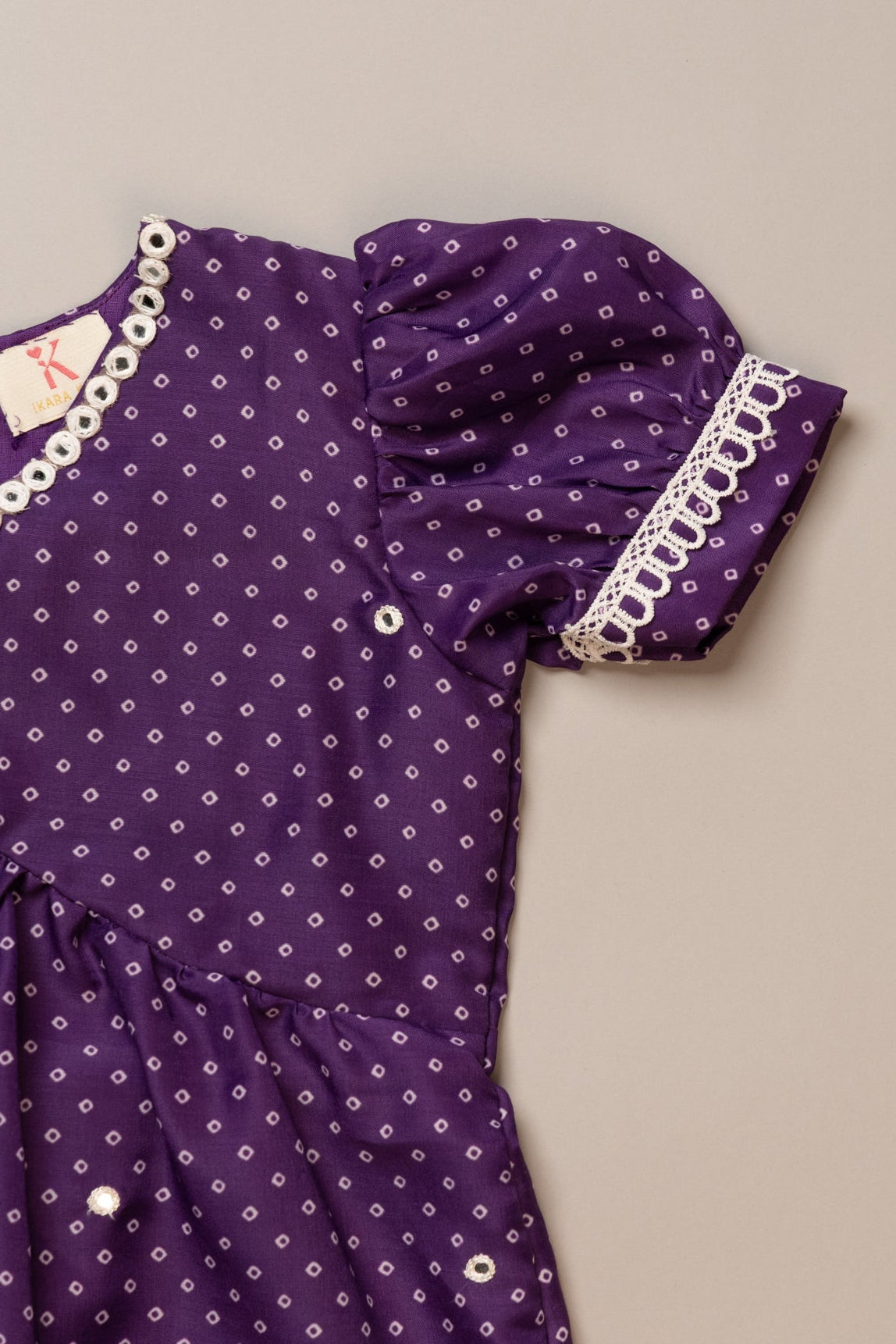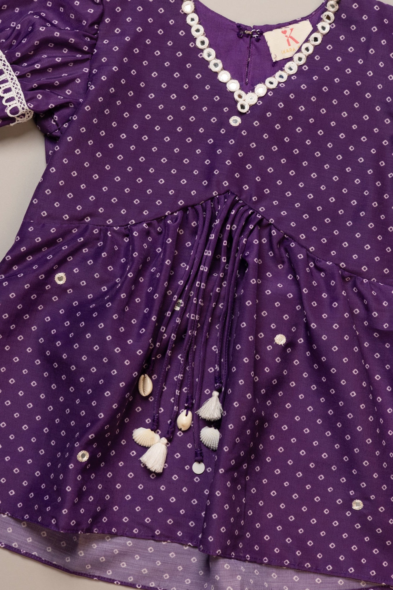 This vibrant purple Bandhej set with its flattering peplum top and tulip pants is bold, breezy, and made to stand out. Easy to wear, hard to forget.
