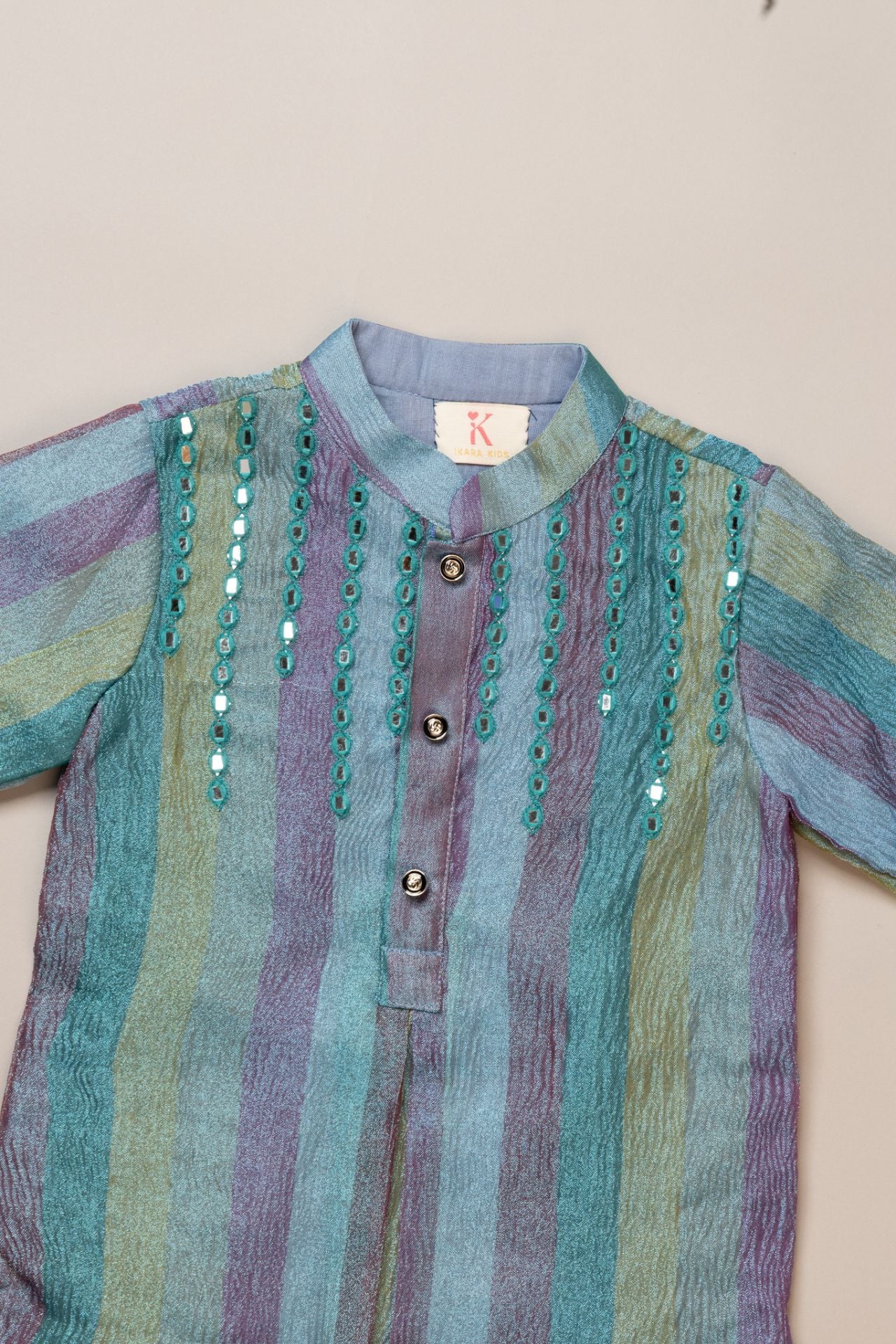 This vibrant tissue kurta is a riot of colours with intricate mirror work on the shoulders.