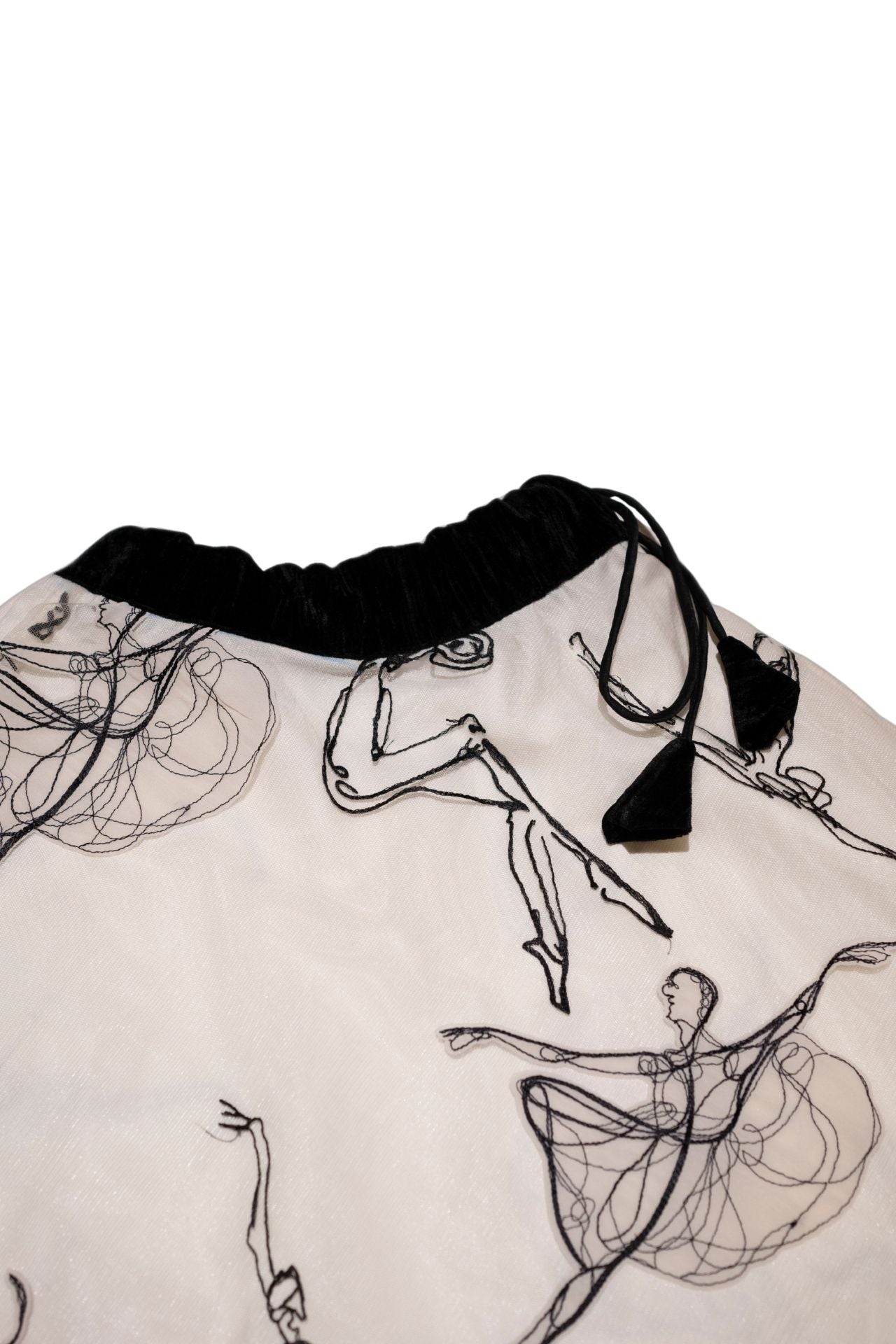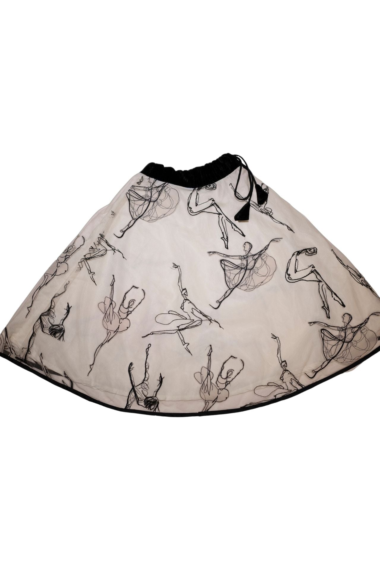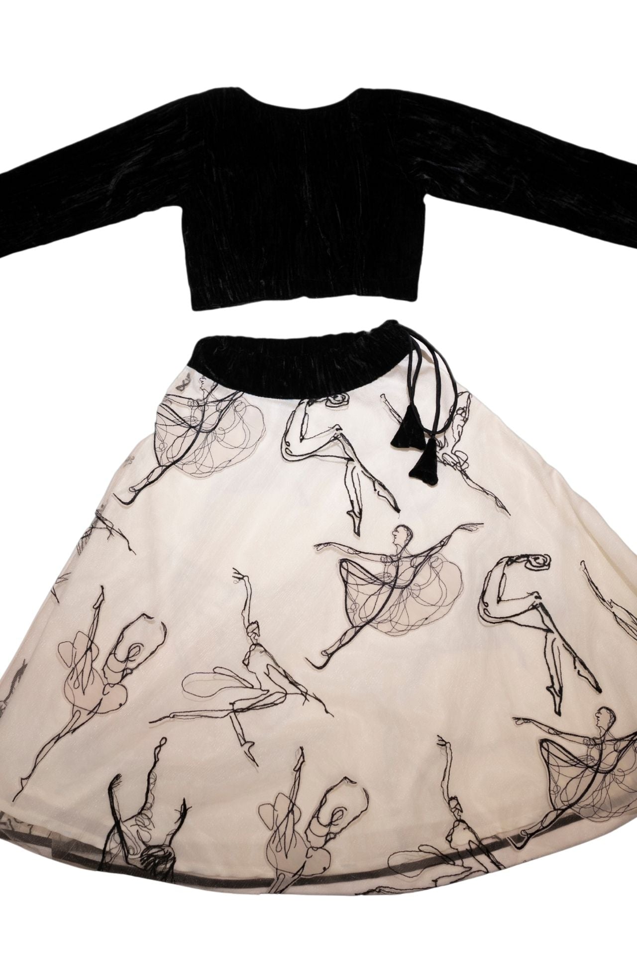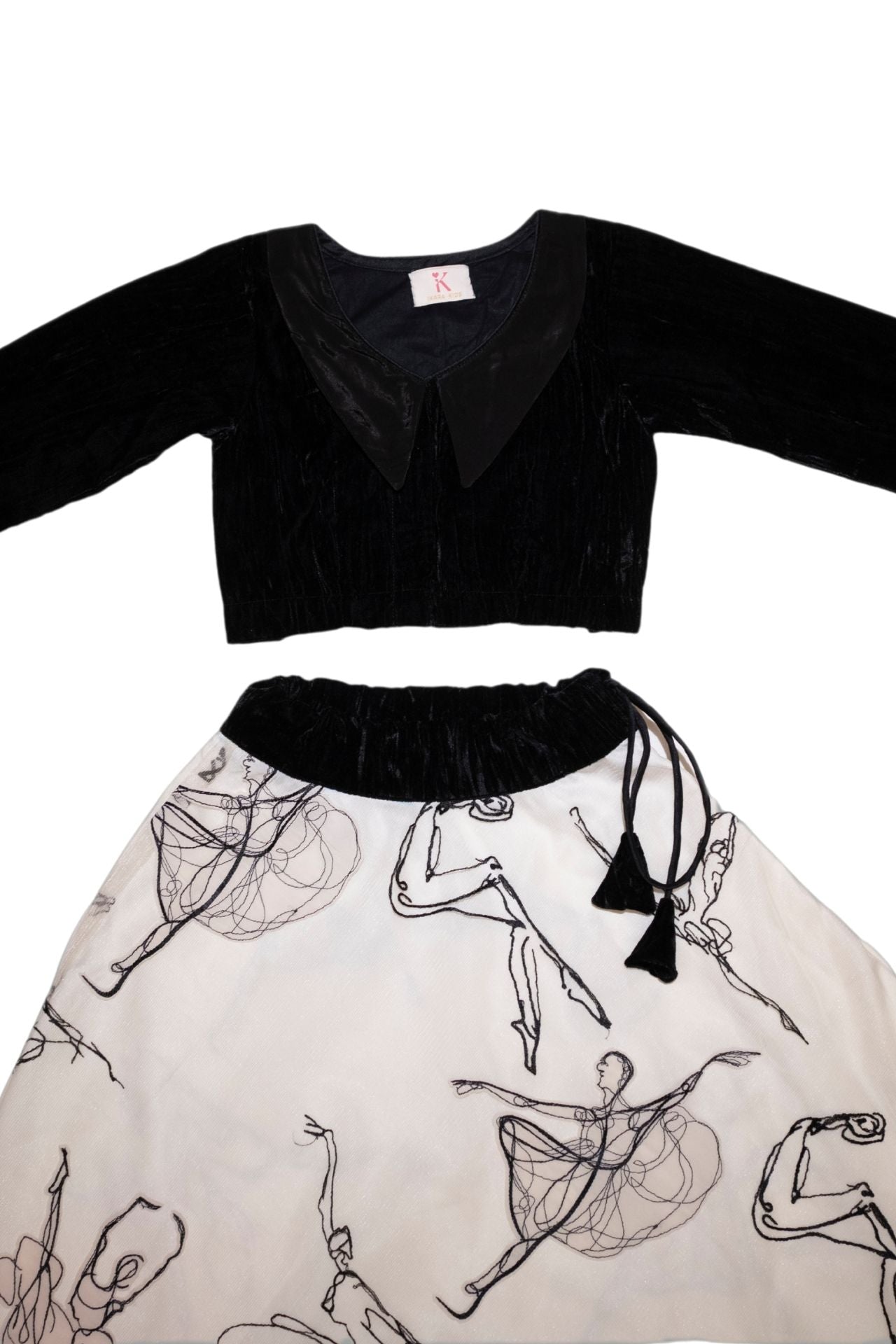 A black top along with a white skirt with soft ballet frills and pearls — perfect for dancing through parties in style.