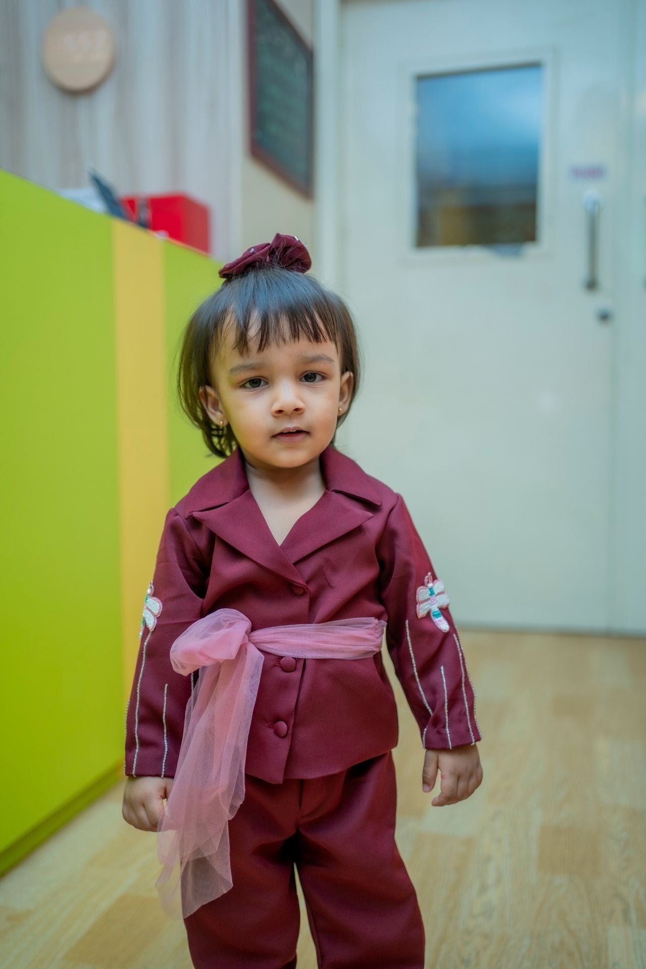A maroon blazer set with intricate wasp detailing and a chic belt — sharp tailoring for your little fashion leader.