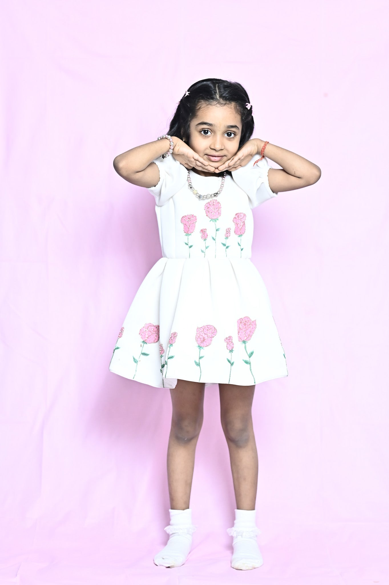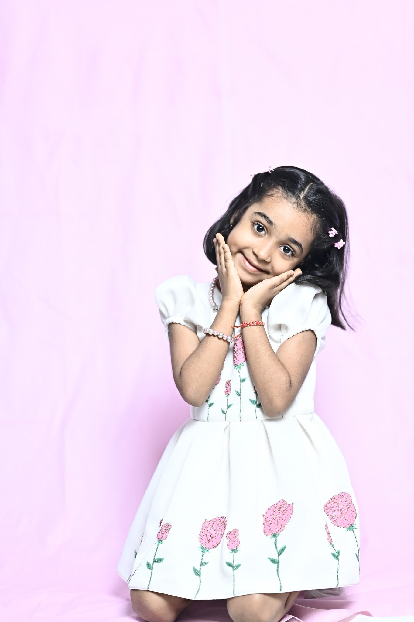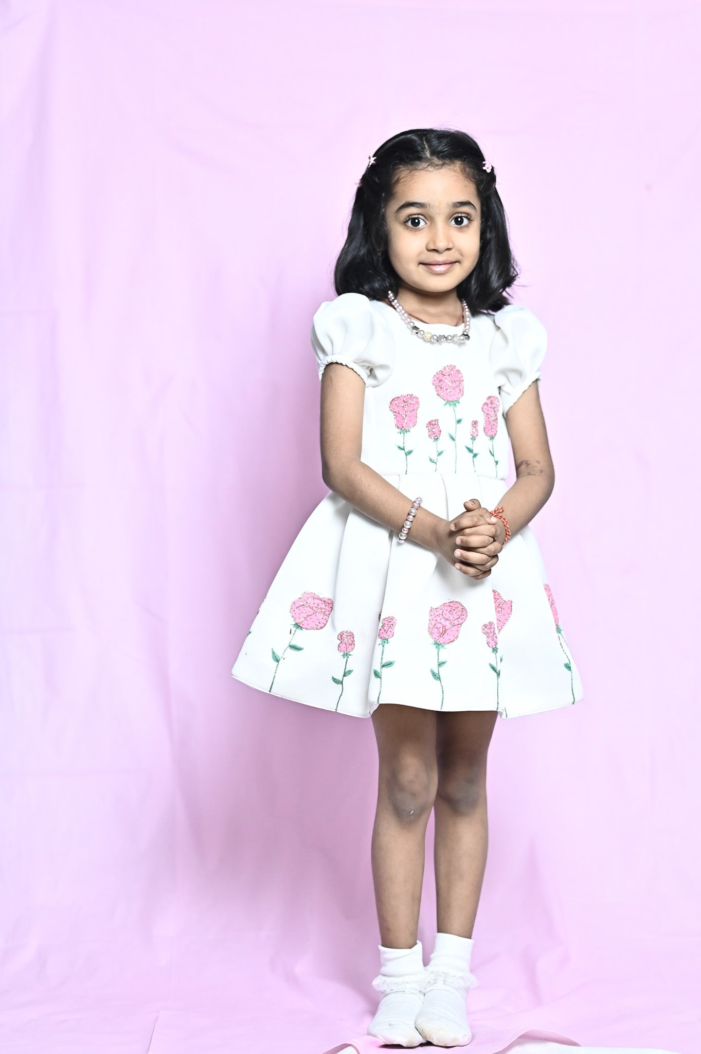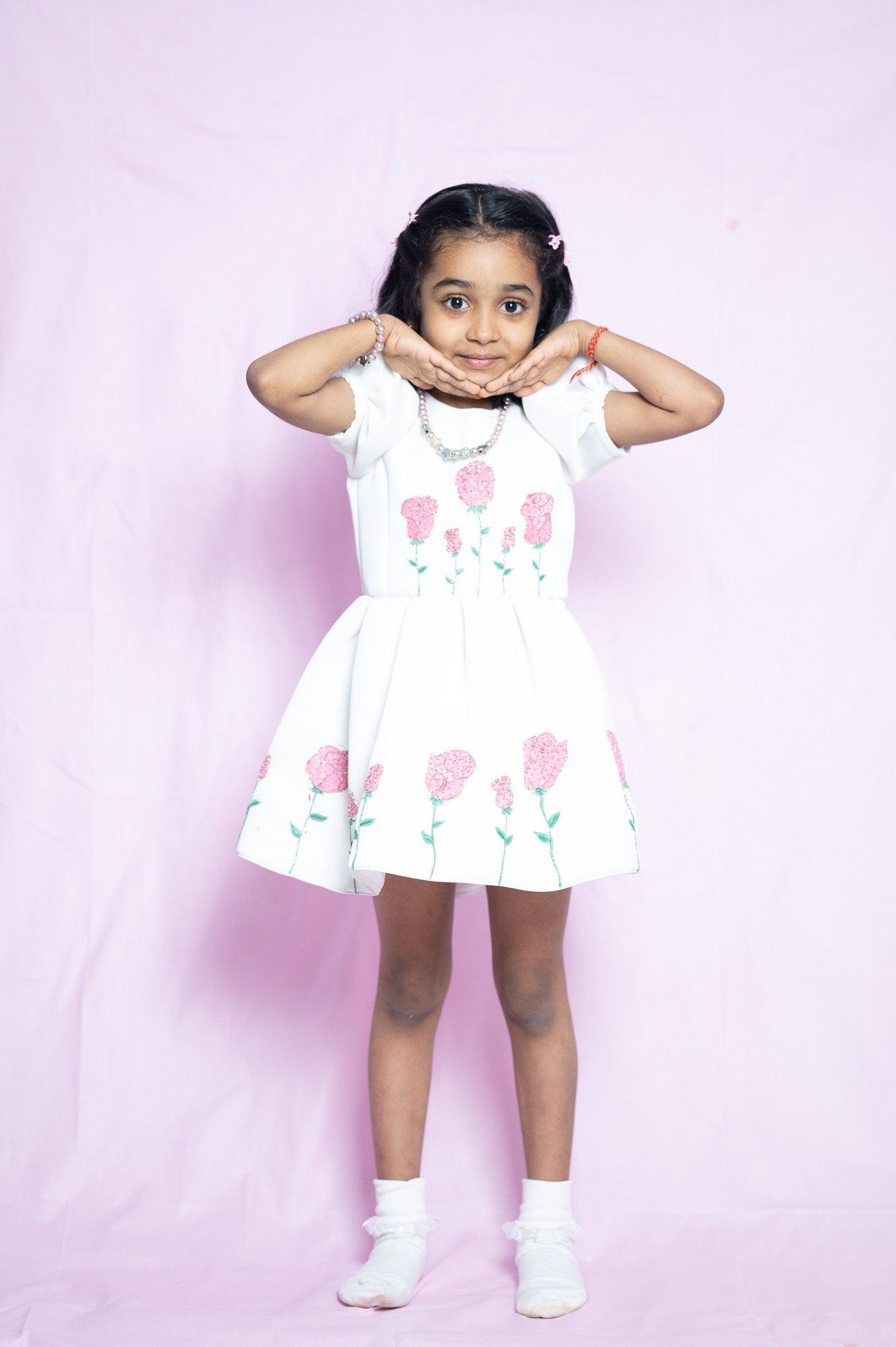 A dress as delicate as a dream, this frock is hand-painted roses, is crafted with love and care for special moments.